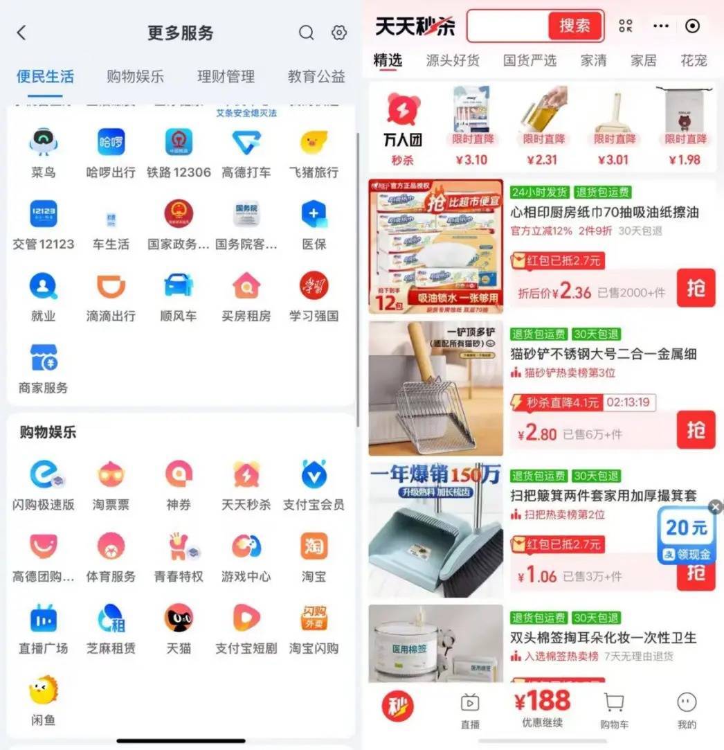 淘宝天猫试图成为一个以交易为核心、不断向内容与服务外延的大消费平台。但不可忽视的是,支付宝既能完成淘宝天猫承担的消费功能,又覆盖了后者无法承载的生活与金融服务。从这个意义上说,支付宝同样可以被视为一个大消费平台,甚至还是一个功能边界更广、使用频率更高的大消费平台。