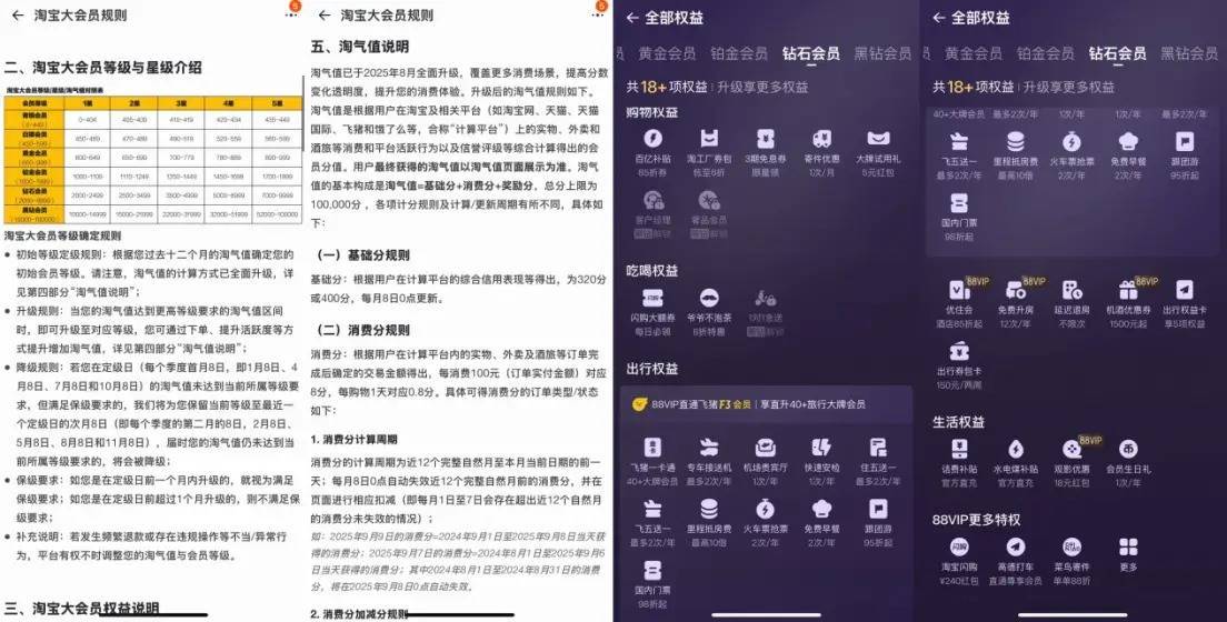 二者在会员权益上的形态也非常接近。淘宝大会员的核心是淘气值。淘气值的计算,明确围绕“在阿里消费”展开,主要由购物金额、购物频次、互动行为构成。买得越多、买得越勤、越活跃,等级越高,权益也就越集中在购物折扣、优惠券、包邮、试用和部分文娱内容上。